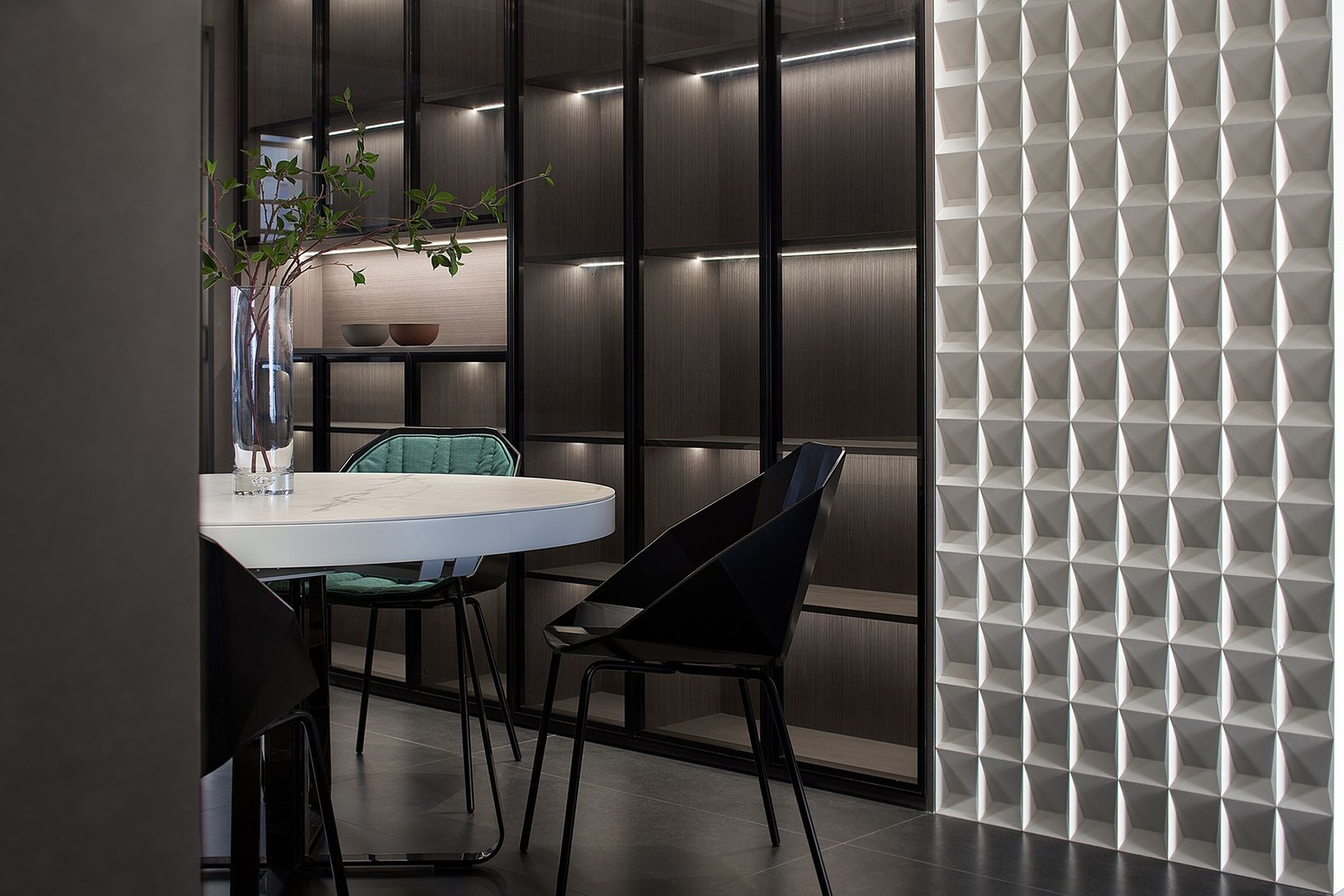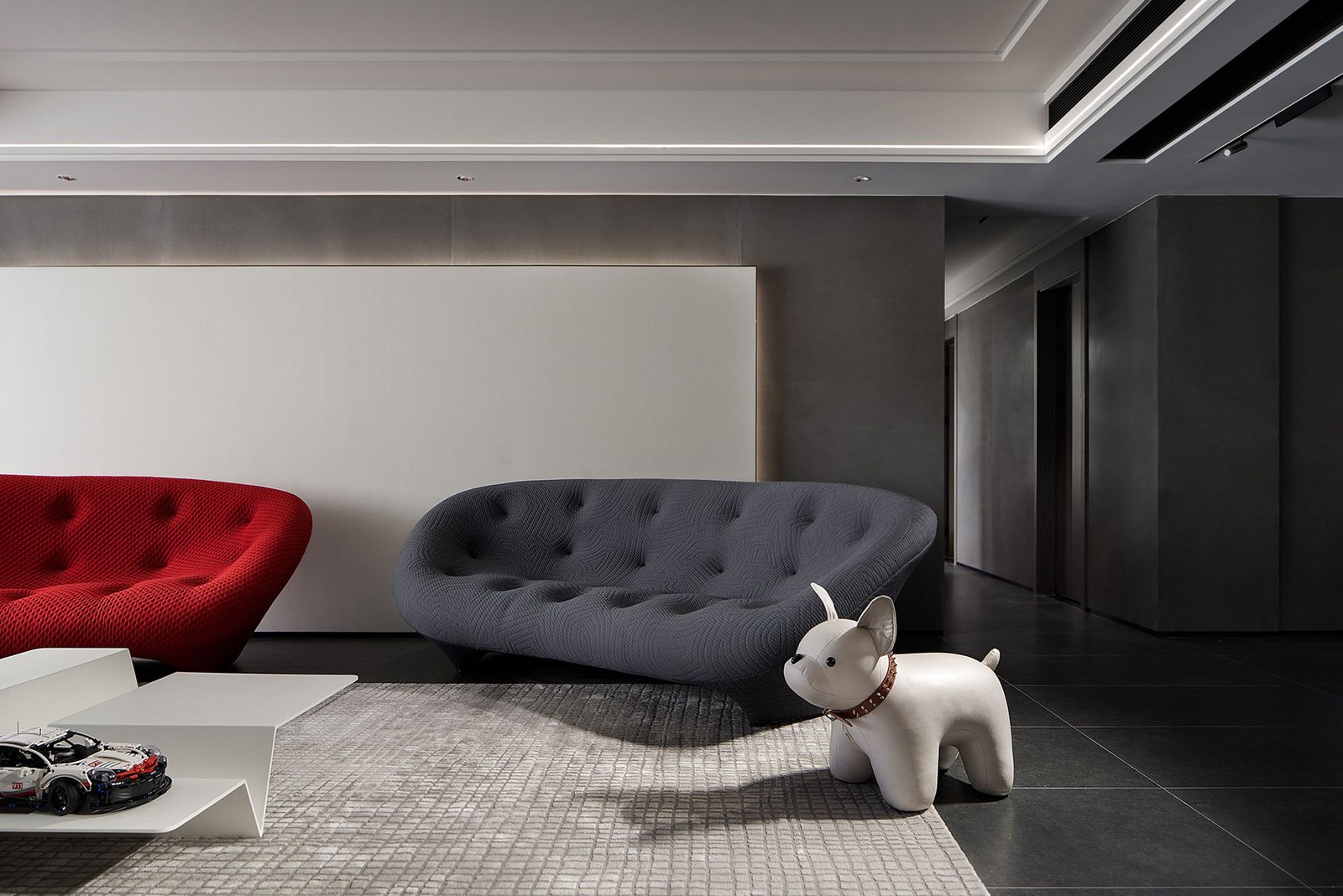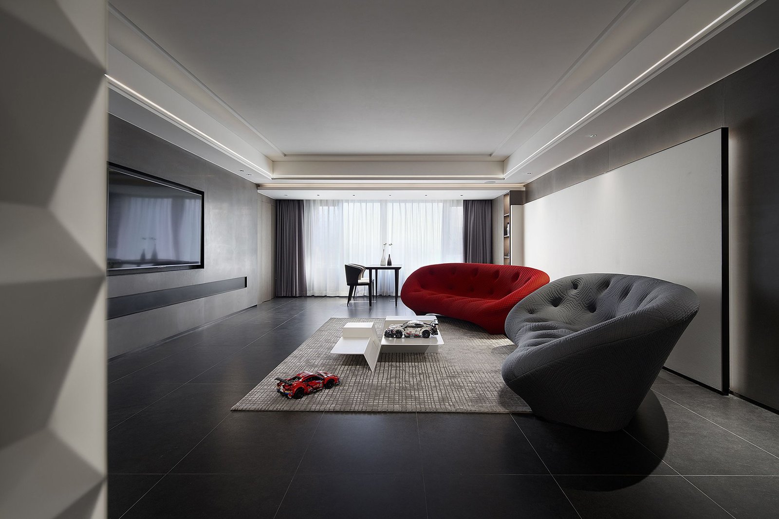The gray slabs in the whole house are matched with stainless steel and blank space. The whole space is full of strong black, white and gray color contrasts, which is very modern and minimalist. The bold color matching of red and gray sofas catches your attention immediately. The slightly indifferent temperament is neutralized, and the space has a playful and soft background, which seems to record the hindsight and experience on the growth road, and is also the precipitation of years. The simple life in the world is plain and happy.